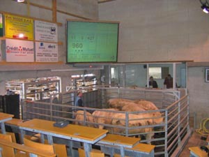 Quand ils arrivent sur le marché, les acheteurs doivent passer au secrétariat pour demander un pupitre leur permettant de miser et de communiquer avec le chef des ventes si nécessaire. Celui-ci leur est accordé s’ils ont fourni au marché une caution bancaire. Les acheteurs, installés autour du ring sur des pupitres équipés de boutons reliés à l’ordinateur du chef des ventes, font monter les enchères lorsqu’ils sont intéressés par un lot d’animaux (en appuyant sur leur bouton). Les achats sont anonymes puisque acheteurs et vendeurs sont désignés par des numéros et ne se voient pas. Lorsque son animal est présenté, le vendeur est à côté du chef des ventes, dans une cabine isolée prévue à cet effet. Quand les acheteurs ont donné leur prix maximum, c’est lui qui prend la décision d’accepter ou de refuser la vente. Si l’éleveur refuse la proposition de l’acheteur, l’animal est invendu. |